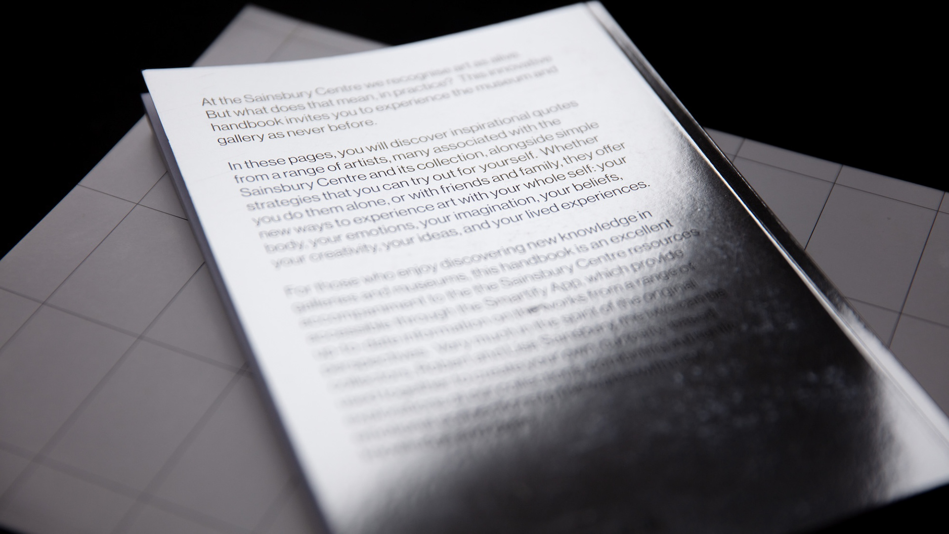 I was commissioned to lead the design and concept for a resource accompanying the relaunch of the Sainsbury Centre. This evolved into A Handbook for Living Art. The publication offers a series of practical steps and techniques to help individuals form a personal connection with a living work of art. Since the content was primarily text-based, featuring quotes and activities, I designed an engaging manual-style publication. The handbook is perfect bound, with a mirrored cover that reflects the reader, reinforcing its interactivity as a resource.